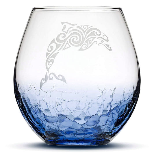 Crackle Wine Glass, Dolphin Design, Laser Etched or Hand Etched, 18oz