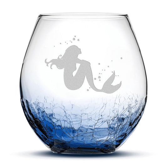 Crackle Wine Glass, Mermaid 5 Design, Laser Etched or Hand Etched, 18oz