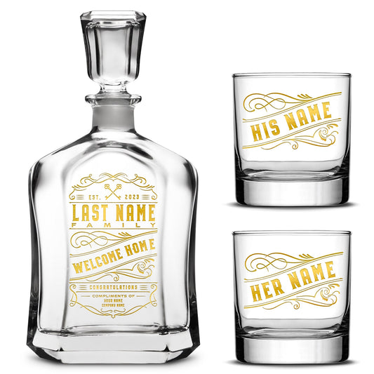 Customizable Welcome Home Refillable Etched Capital Decanter with Set of 2 Custom Whiskey Glasses, Laser Etched or Hand EtchedRegular price $114.99 USDRegular priceUnit price / per