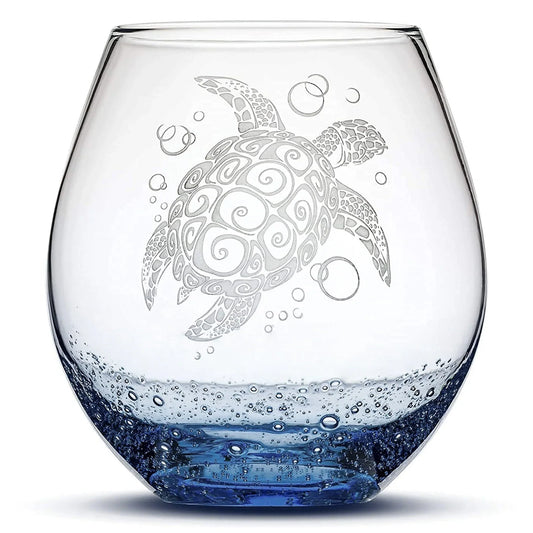 Less Than Perfect Discounted Bubble Wine Glass with Tribal Sea Turtle Design, Laser Etched or Hand Etched