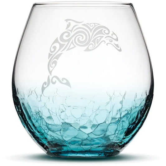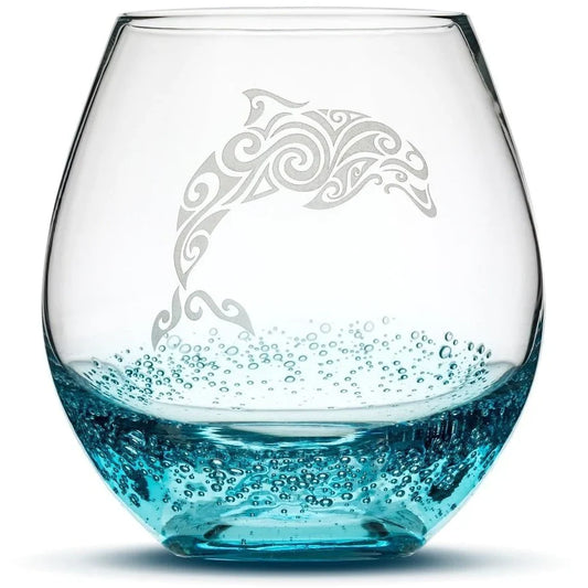 Less Than Perfect Bubble Wine Glass with Tribal Dolphin Design, Laser Etched or Hand Etched