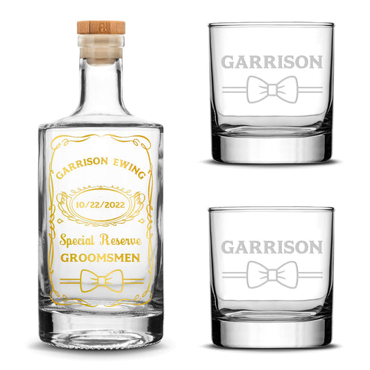 Customizable, Special Reserve Groomsman, Premium Refillable Jersey Style Liquor Decanter and (Set of 2) Premium Whiskey Glasses, Handmade, Handblown, Hand Etched Gifts, Sand Carved, 750ml, Laser Etched or Hand Etched