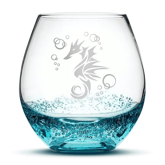 Bubble Wine Glass with Seahorse Design, Laser Etched or Hand Etched