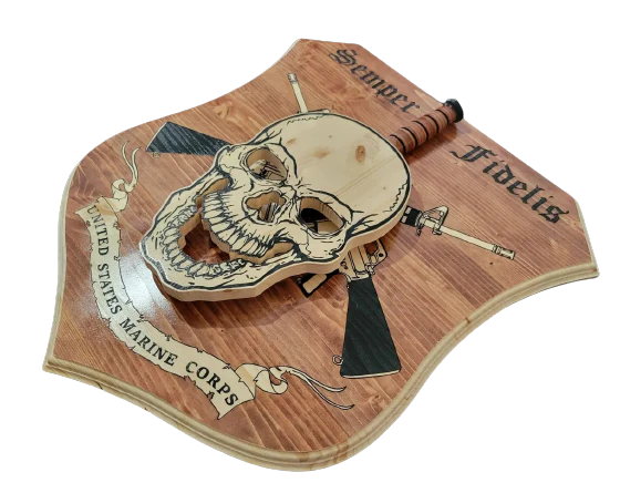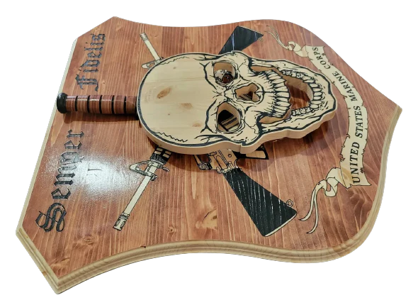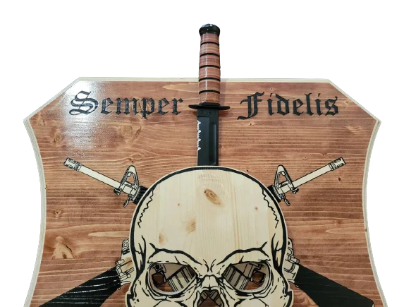 Introducing the 24" Skull KA-BAR Holder with Backboard - a striking tribute to the indomitable spirit of the United States Marine Corps. Crafted with precision and care, this solid wood construction product is designed to showcase your prized KA-BAR knife with style and honor. Featuring a captivating wooden plaque, this product is adorned with a meticulously detailed skull and two guns, symbolizing the unwavering bravery and commitment of the Marines. The sign above the skull proudly states "semper fidelis united states marine corps," serving as a constant reminder of the Marine Corps' core values and dedication to duty. Measuring 24 inches in length, this KA-BAR holder offers ample space to display your cherished knife securely and prominently. The solid wood construction ensures durability and longevity, guaranteeing that your KA-BAR and its accompanying plaque will stand the test of time. Whether you're a Marine Corps enthusiast, a proud member of the military, or simply appreciate fine craftsmanship, this 24" Skull KA-BAR Holder with Backboard is a must-have addition to your collection. Display it in your home, office, or any space where you seek to pay homage to the brave men and women who serve our country. Don't miss the opportunity to showcase yours.
