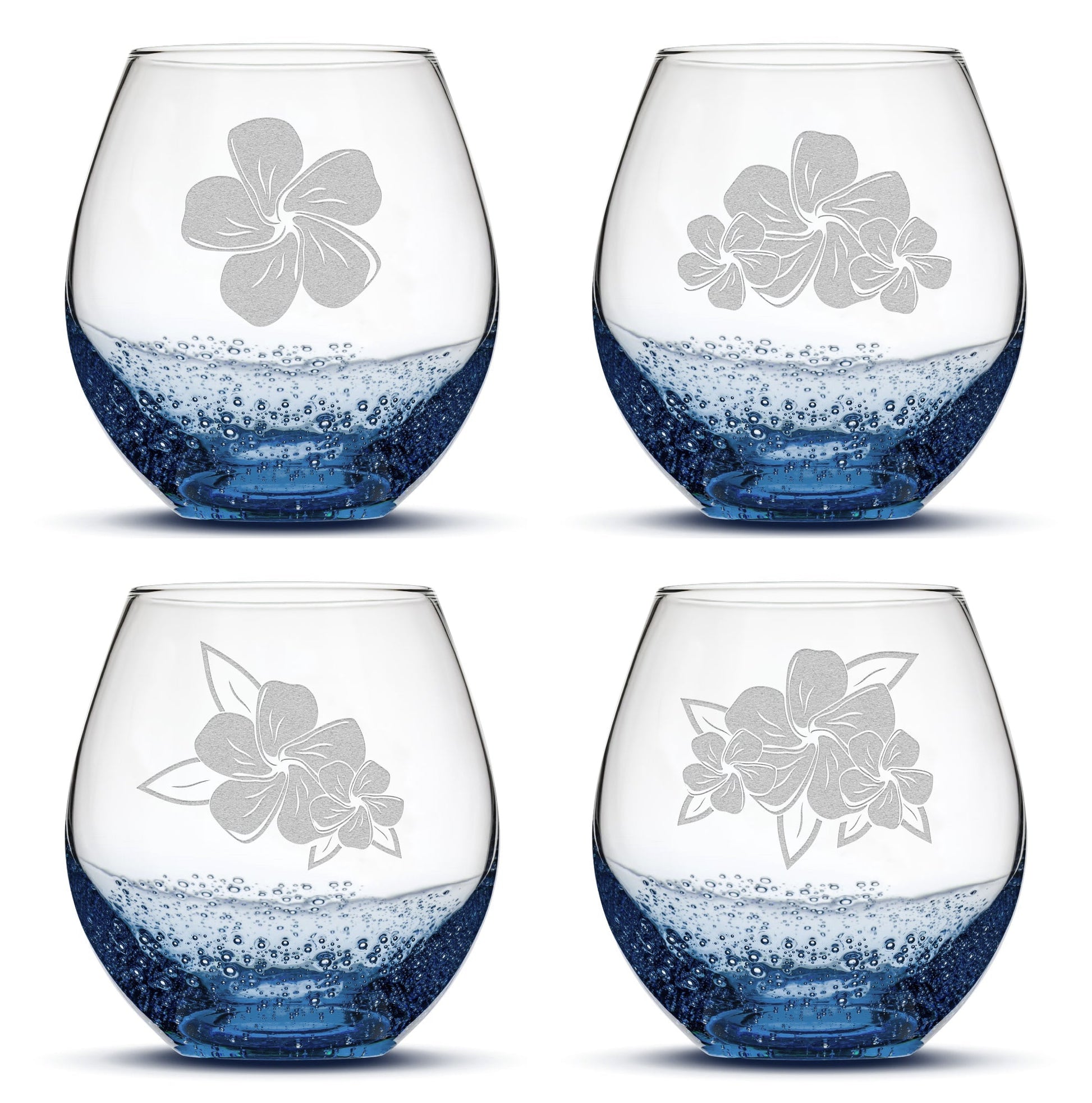 Bubble Stemless Wine Glasses, Plumeria, Set of 4, Laser Etched or Hand Etched