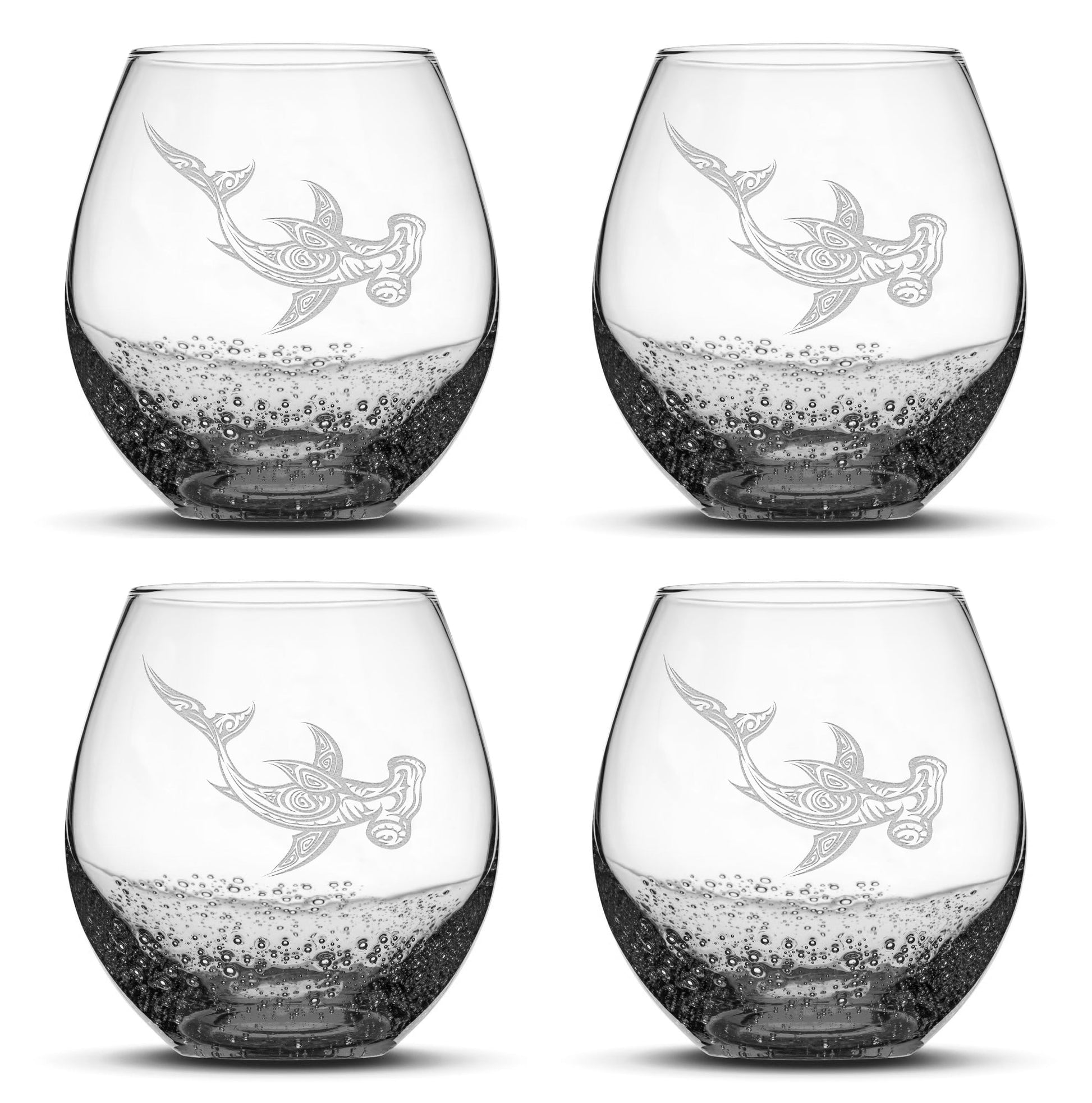 Bubble Wine Glasses with Tribal Hammerhead Shark, Set of 4, Laser Etched or Hand Etched