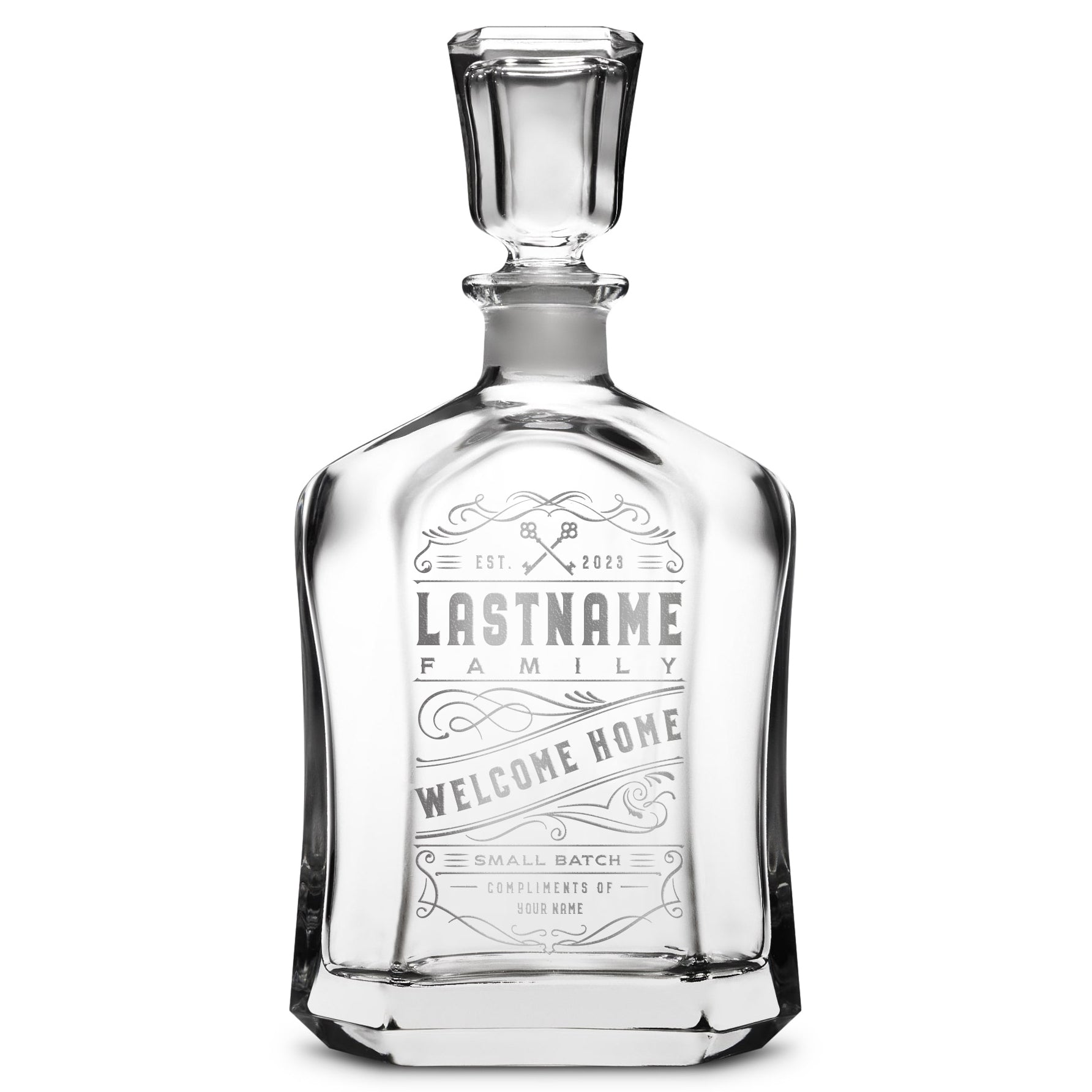 Customizable Welcome Home, Premium Refillable Capital Style Liquor Bottle, Handmade, Handblown, Hand Etched Gifts, Sand Carved, 750ml, Laser Etched or Hand Etched