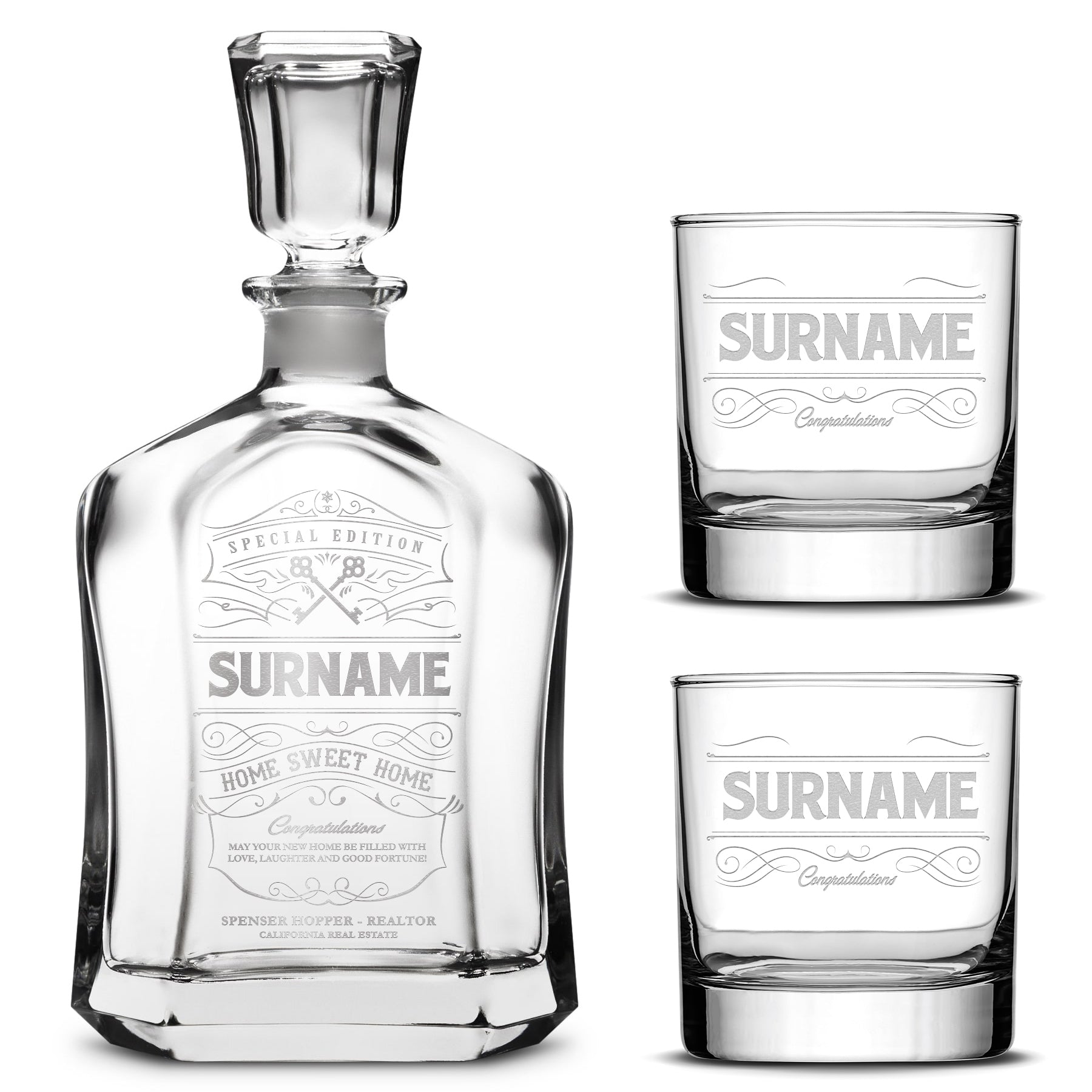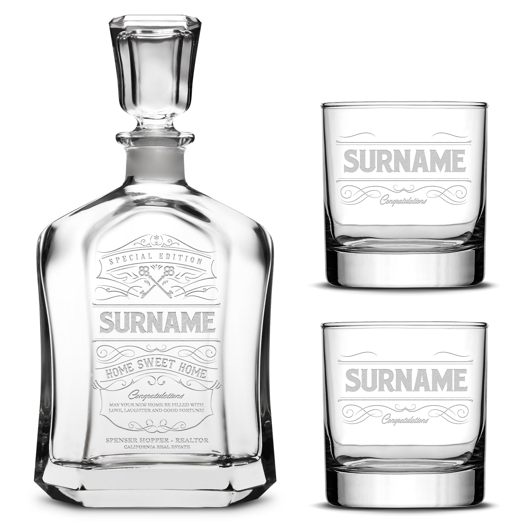 Customizable, Premium Refillable Capital Style Liquor Decanter and (Set of 2) Premium Whiskey Glasses, Handmade, Handblown, Hand Etched Gifts, Sand Carved, 750ml, Laser Etched or Hand Etched
