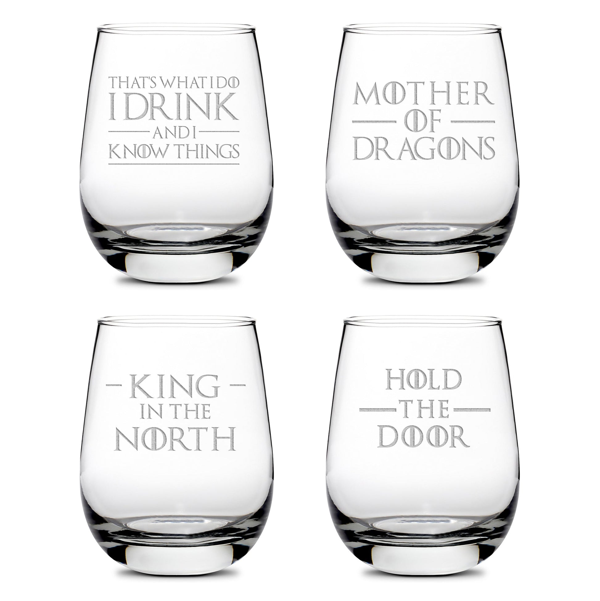 Premium Wine Glasses, Game of Thrones, I Drink and I Know Things, Mother of Dragons, King in the North, Hold the Door (Set of 4), Laser Etched or Hand Etched