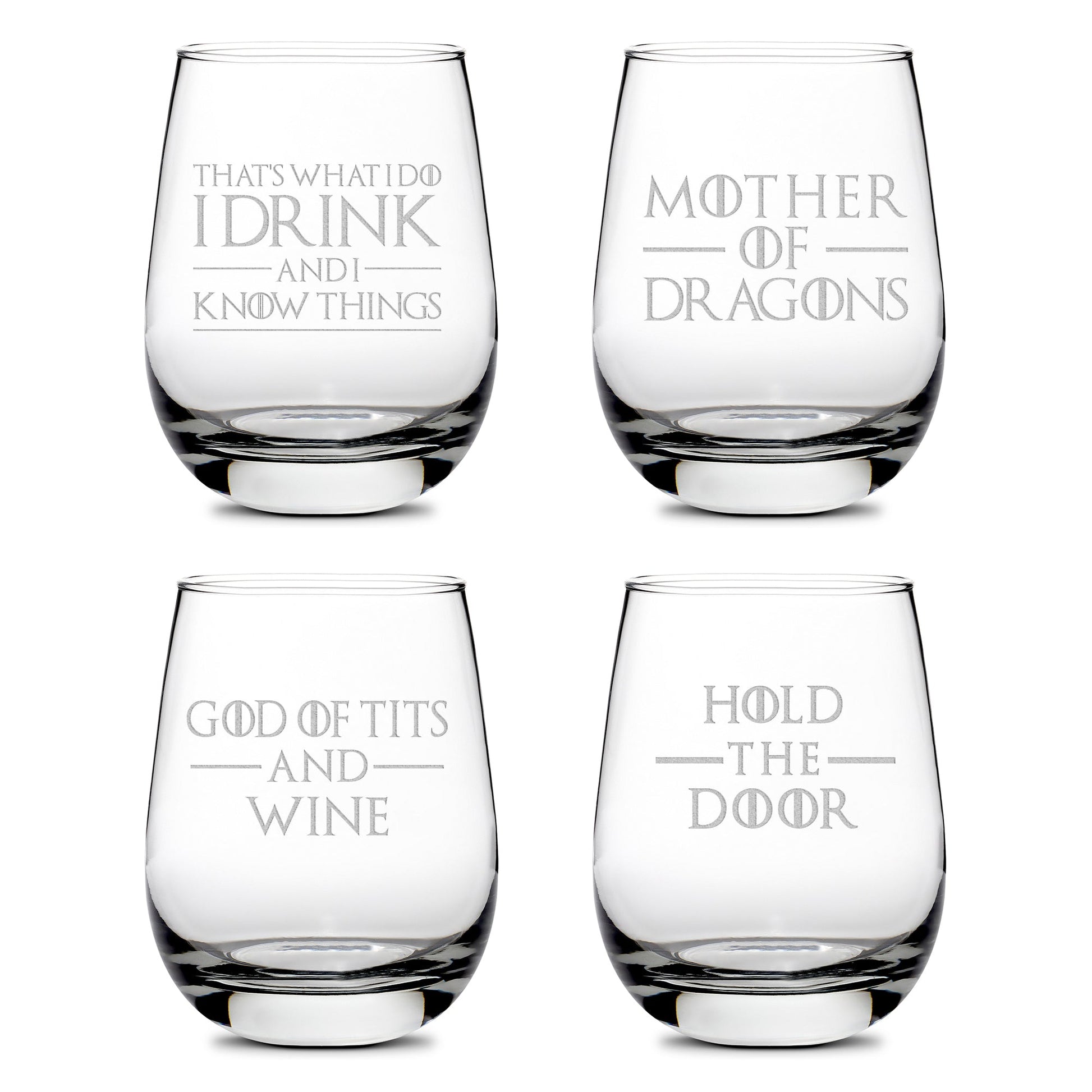 Premium Wine Glasses, Game of Thrones, I Drink and I Know Things, Mother of Dragons, Hold the Door, God of Tits and Wine (Set of 4), Laser Etched or Hand Etched